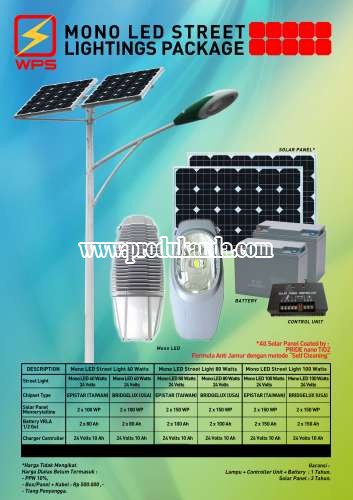 Paket MONO LED Street Lighting ditujukan untuk penggunaan solar power LED Light pada penerangan jalan umum, dengan watt yang lebih rendah dan cahaya yang lebih terang daripada lampu-lampu konvensional.